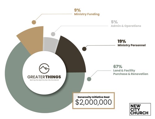 God regularly provides for New City Church through your faithful giving of a tithe. This funds our operating budget: paying our staff, the costs of our facility, and our ministry expenses. We hope you will give generously to the Greater Things initiative, but only if you will do so over and above your regular giving.